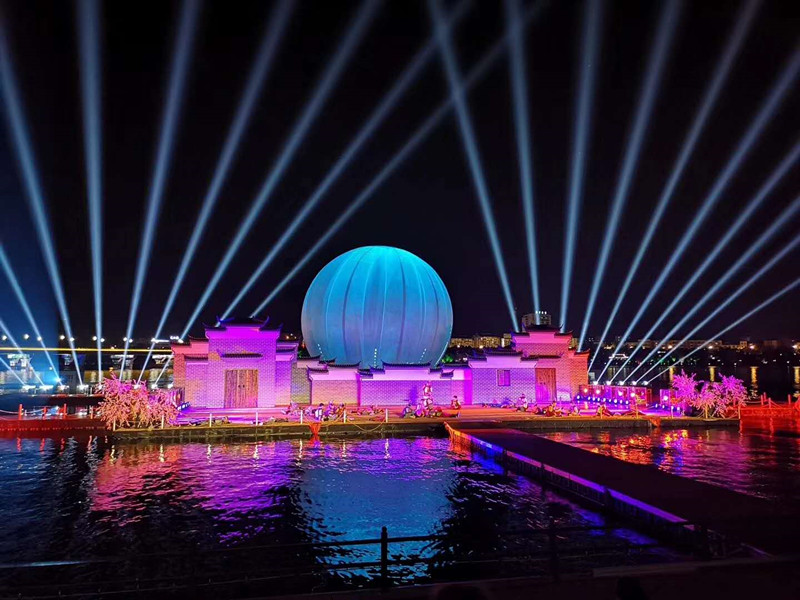為達到節(jié)目效果,并為西海灣景區(qū)增添新的亮點,《遇見武寧》專建了大劇場,總面積3萬平方米,劇場分業(yè)態(tài)服務(wù)、行政辦公、演藝舞臺、音樂噴泉等功能區(qū),其中演藝舞臺面積4000平方米,可同時容納600名觀眾觀看演出。