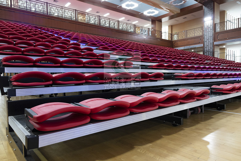 體育館看臺(tái)全部設(shè)計(jì)為伸縮看臺(tái),二樓為7層,一樓為16層,全部采用電動(dòng)伸縮。座椅采用翻板靠背吹塑椅,整體美觀大氣。