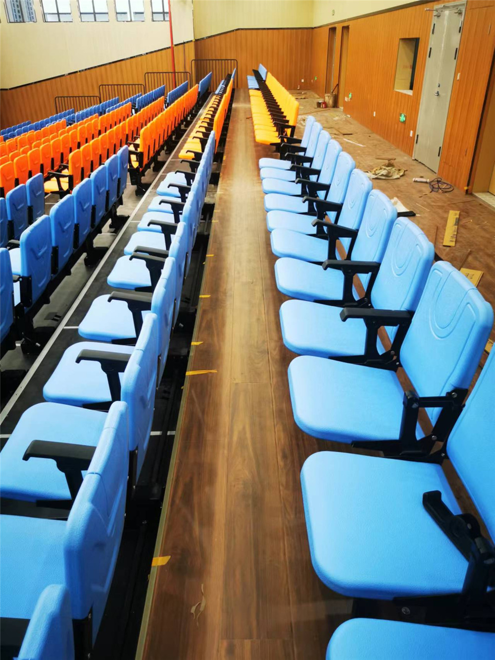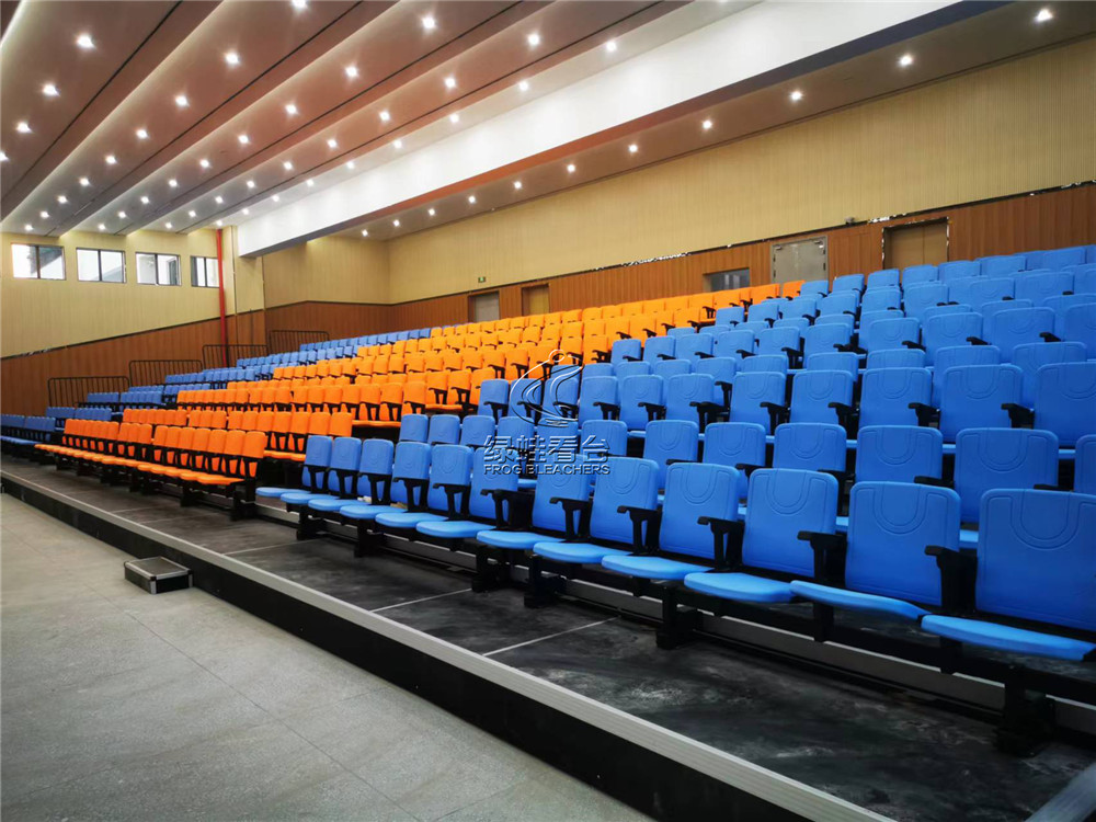活動看臺采用鋼焊接組裝連接,所有安裝用鋼件均采用靜電噴涂處理,層寬1800mm。首層高330mm,錯層高400mm, 活動看臺踏板材料選用17mm防火防滑舞臺板,活動看臺為電動控制,保證左右行走距離一致,在伸展與回縮中無定向跑偏、卡死、打滑、跳齒現(xiàn)象。活動看臺觀眾席采用高靠背吹塑翻板座椅,后置式安裝方式,座距490mm,后邊和側(cè)邊(第一層除外)加安全防護欄桿,欄桿高度為1100mm;并且看臺展開時,即處于使用狀態(tài)下,觀眾可通過伸縮看臺的走道直通二樓區(qū)域。