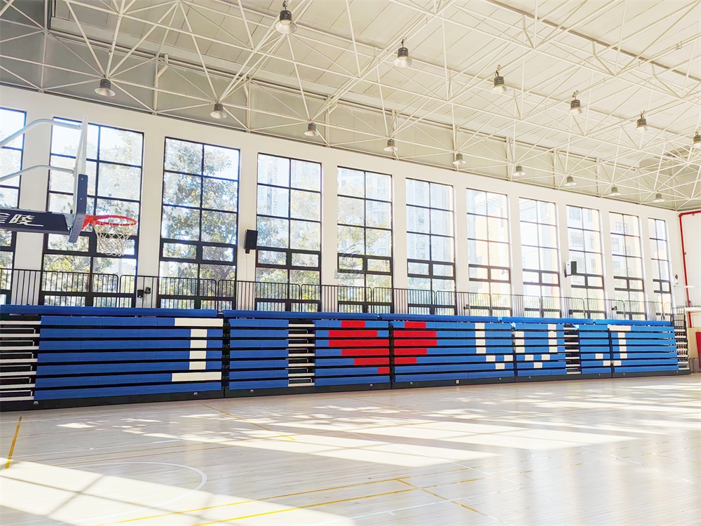學(xué)校體育館建成多年,一直沒有設(shè)置成規(guī)模的觀眾席看臺。在綠蛙看臺的建議下,學(xué)校決定在原體育館增加伸縮看臺。本活動看臺采用鋼焊接組裝連接,所有安裝用鋼件均采用靜電噴涂處理,層寬700mm,尾層寬400mm。首層高330mm,錯層高300mm, 活動看臺踏板材料選用17mm防火防滑舞臺板。