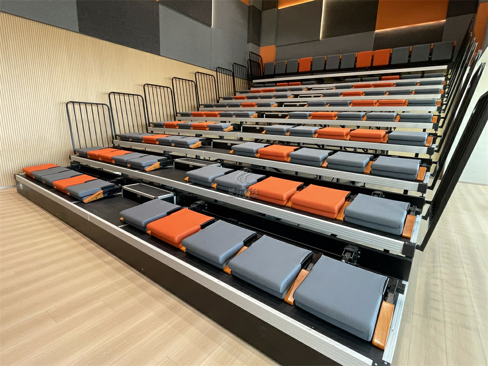 伸縮看臺(tái)整體為10層,電動(dòng),配置后置式軟包座椅,顏色搭配選擇灰和橙色,與室內(nèi)的吸音墻顏色高度協(xié)調(diào)。
