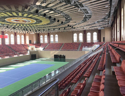 廣東工商理工學(xué)院體育館,是2018年廣東省運(yùn)會(huì)場(chǎng)館,網(wǎng)球比賽將在這里舉行。該場(chǎng)館可容納3000人,看臺(tái)顏色搭配一改常規(guī)的五顏六色,采取以紫紅為主色調(diào),深淺搭配,錯(cuò)落有致不失協(xié)調(diào),實(shí)乃顏色配置上佳之作。