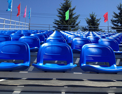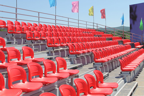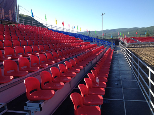 該看臺應(yīng)用于阿爾山國際馬術(shù)表演場地??磁_三面圍繞賽馬場地,總共2000位,看臺整體起高1.2米,視野開闊,方便觀眾觀看??磁_橫拉斜拉布滿,結(jié)構(gòu)穩(wěn)固,每層都安裝側(cè)檔板,保證安全可靠??磁_座椅采用紅藍搭配,顏色醒目,與草原的藍天白云配在一起。整體美觀大方。