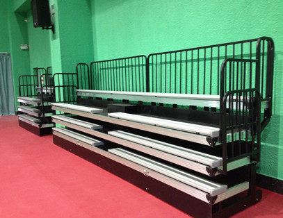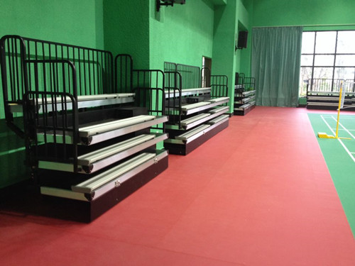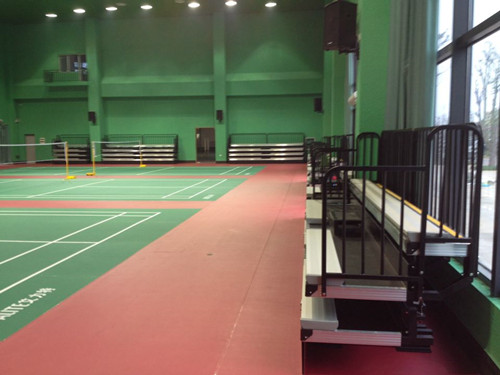 該看臺為四層手動伸縮看臺,看臺采用綠蛙特有導軌結構,伸縮流程??磁_整體采用亮光黑顏色,再配以金屬原色的鋁合金座板與鋁合金封邊條,形成強烈反差,并與羽毛球場地顏色相得益彰,整體美觀大方。