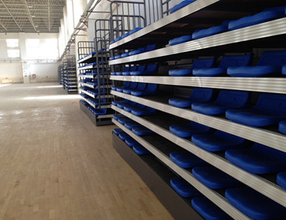 該看臺為電動伸縮看臺和輪式可翻轉(zhuǎn)看臺組合,可以滿足場地的多功能使用。當使用中間的籃球場地進行比賽時,伸縮看臺全部展開,輪式可翻轉(zhuǎn)看臺置于籃球場南北兩側(cè),可滿足800人的觀眾座位數(shù)。