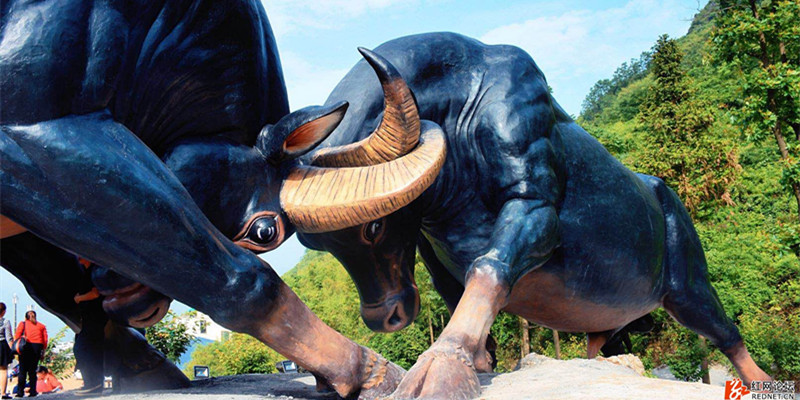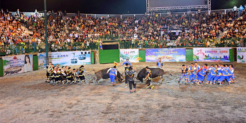 地處安化縣馬路鎮(zhèn)云臺(tái)山風(fēng)景區(qū)的全國首家斗牛演藝廣場卻一如白晝,吶喊聲、喝彩聲不絕于耳。一場集斗牛、雜技、歌舞于一體的視覺盛宴在此如期舉行,1萬多名觀眾齊聚共同欣賞。