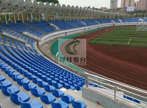 安裝了綠蛙看臺座椅后的體育場,如同披上了彩色的新裝,主席臺選用紅色,其他觀眾席選用藍(lán)色。整體大氣磅礴,為美麗的山城貴定增添了新的一筆彩色。
