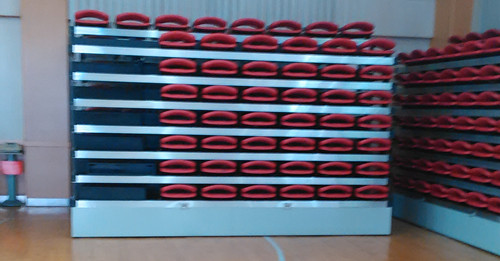 學(xué)校體育館常舉辦活動,觀眾看臺基本采用普通椅子,在校方領(lǐng)導(dǎo)指示下,經(jīng)商議采用綠蛙公司可移動伸縮看臺,用時展開,不用時收在墻角。