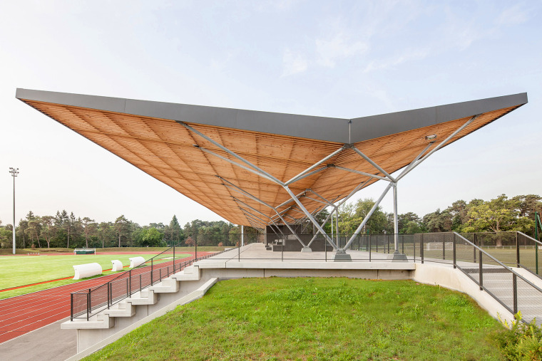 天棚覆蓋整個(gè)平臺(tái)和座位區(qū)。折線屋頂呈向谷地匯合的姿態(tài),中間有一條長的溝槽。以17米為間距分布的樹狀立柱組成了屋頂?shù)闹误w系。每個(gè)樹狀柱包含3個(gè)分柱,與漆面鋼管在高度超過3米處形成雙向鉸接。每套柱子組成一個(gè)三角形結(jié)構(gòu),為屋頂提供6個(gè)支撐點(diǎn),以確保屋頂有足夠的橫向強(qiáng)度。房頂結(jié)構(gòu)采用道格拉斯冷杉木,由兩對(duì)分布在不同截面上的粘結(jié)梁組成,通過13個(gè)桁條實(shí)現(xiàn)連接。垂直支撐由中心的矩形體塊提供。上面覆蓋著波紋聚碳酸酯板的表面。遮陽蓬的下表面是由厚實(shí)的道格拉斯杉木制成的密網(wǎng),它能過濾陽光的直射,并通過光線的變化和木材的紋理共同強(qiáng)調(diào)屋頂?shù)妮喞?/p>