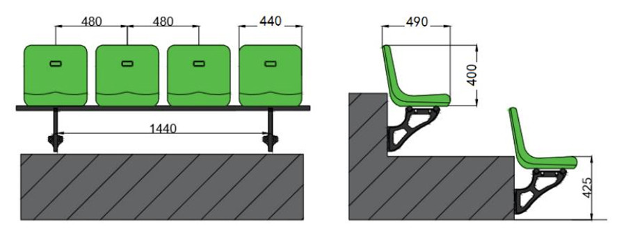 座椅采用側(cè)裝方式的座椅,椅面距地面高度約為420mm左右,座椅支架選用優(yōu)質(zhì)壓鑄鋁支架連接鍍鋅圓管。壓鑄鋁支架采用靜電噴塑處理。支架采用M10×80的擊芯膨脹螺栓與看臺水泥壁面相連,每個膨脹螺栓可抗力100kg以上。鍍鋅圓管外徑不少于φ32mm,厚度不少于2mm。圓管兩端采用橡膠塞頭封口。緊固件、座椅連接件采用鍍鋅處理。