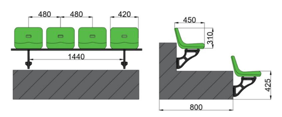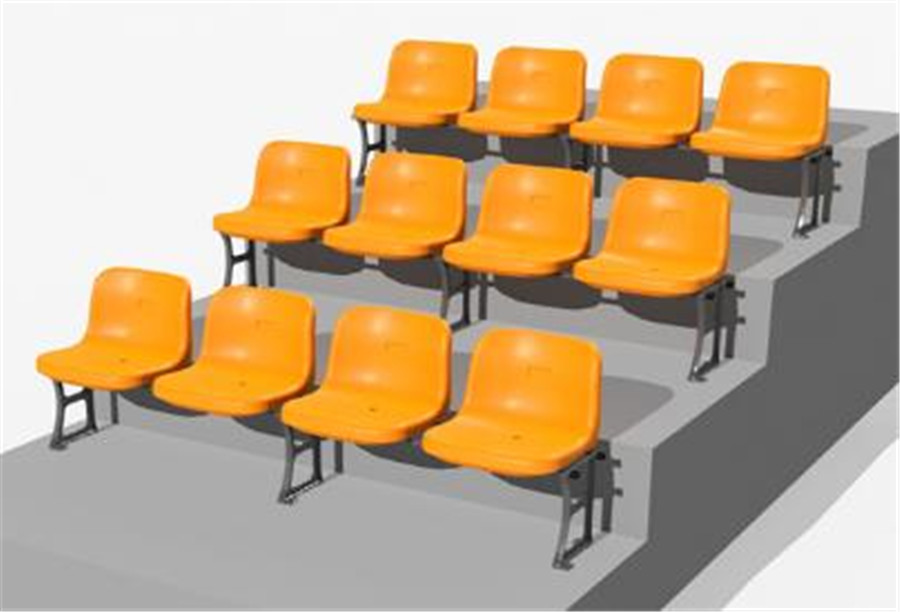 座椅采用站立式安裝方式的座椅,椅面距地面高度約為420mm左右,座椅支架選用優(yōu)質(zhì)壓鑄鋁支架連接鍍鋅圓管。壓鑄鋁支架采用靜電噴塑處理。支架采用M10×80的擊芯膨脹螺栓與看臺水泥壁面相連,每個膨脹螺栓可抗力100kg以上。鍍鋅圓管外徑不少于φ32mm,厚度不少于2mm。圓管兩端采用橡膠塞頭封口。緊固件、座椅連接件采用鍍鋅處理。